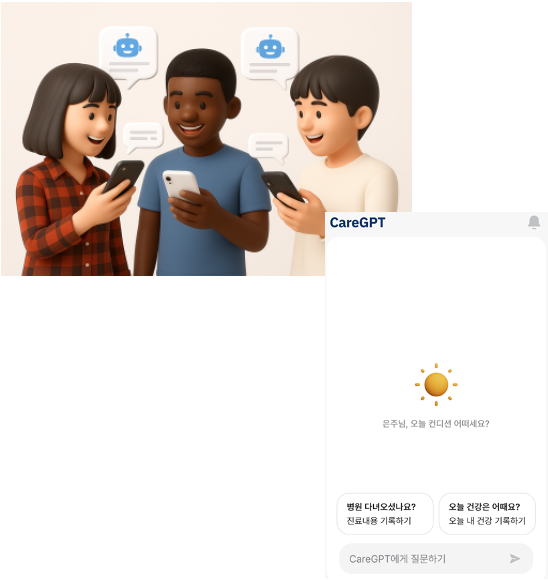 ๋ณ์ ์ง๋ฃ๋ ์ฃผ๊ธฐ์ ์ผ๋ก ์ด๋ฃจ์ด์ง์ง๋ง, ๊ฑด๊ฐ ๊ด๋ฆฌ๋ ๋งค์ผ ํ์ํฉ๋๋ค. CareGPT๋ ๋ง์ฑ ์งํ ํ์๊ฐ ์ผ์ ์์์ ์ค์ค๋ก ๊ฑด๊ฐ์ ์ดํดํ๊ณ ๊ด๋ฆฌํ ์ ์๋๋ก ์ค๊ณ๋ ์๋ฃ ํนํ ์ธ์ด๋ชจ๋ธ ๊ธฐ๋ฐ ๋ํํ ์ผ์ด ์๋น์ค์ ๋๋ค.